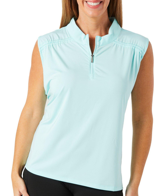Stay cool and confident in this womens active sleeveless quarter zip polo. Designed in a solid color with a sleek zip neckline it features performance stretch fabric and stylish ruching on the shoulders and back for a flattering fit that moves with you.