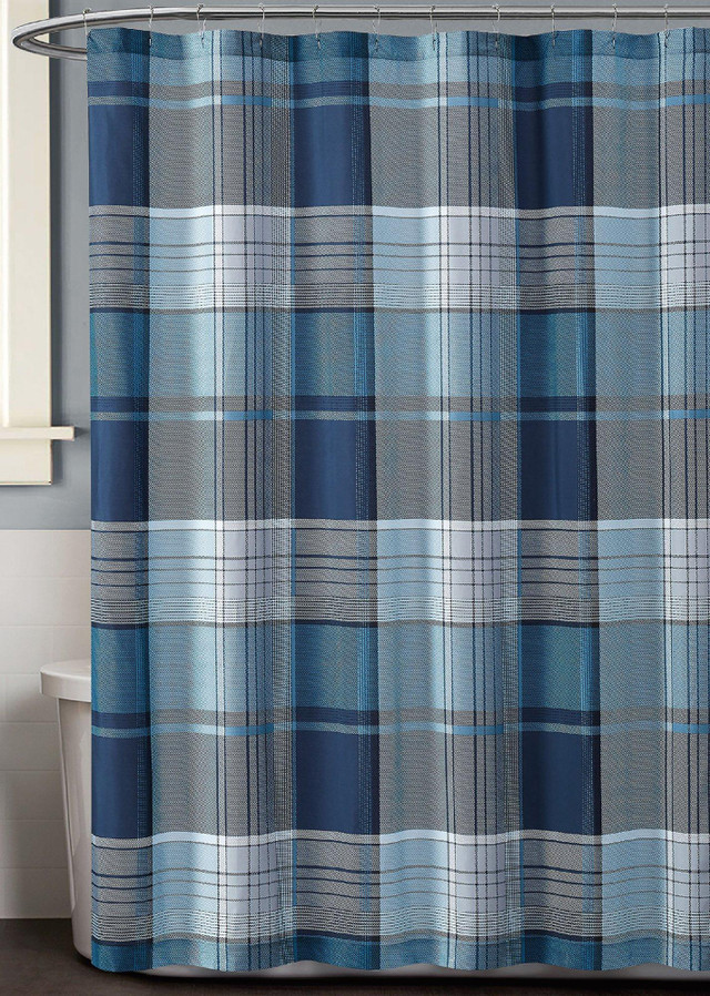 A modern, geometric plaid is the focus of this shower curtain. The printed texture emulates a yarn dyed plaid for added depth. The pattern is dominated by blue and gray shades with ivory tones mixed into the pallet. Items feature Truly Soft face and back material with for softness and performance you can count on. Measures 72 x 72