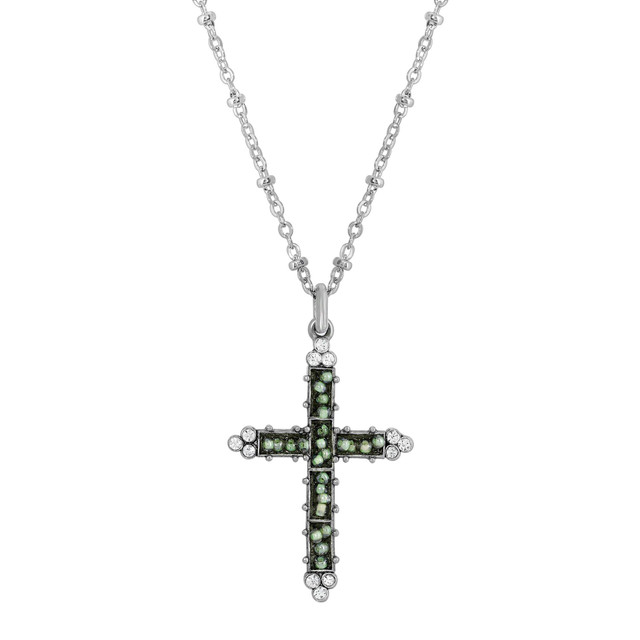 This delicate pewter cross necklace features clear crystal and turquoise seed bead accents. The pendant cross dangles from an adjustable silver tone 16-inch chain, which includes a 3-inch extension and lobster clasp closure. Perfect for inspiring elegance and grace, this necklace is an ideal accessory for any occasion. Length 16 in., width 27mm.