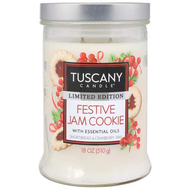 This classic jar with Holiday fragrance brings any home instant ambiance. Crafted with a high fragrance load for a long lasting scent. Contains 2 wicks for a clean, even burn. The fragrance notes are spiced vanilla shortbread cookies topped with cranberry preserves and sugar.