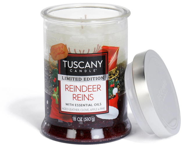 Bring festive cheer to your home with this 18 oz Reindeer Reins 2-Wick Glass Scented Candle. Designed for the Christmas holiday, it features three stacked colors of wax in a clear glass jar with a metal lid. The scent blends aged leather, clove, apple, and pine for a warm, seasonal aroma that enhances any space. Perfect for creating a cozy, holiday inspired ambiance. Measures approximately 5.5 in x 4 in diameter.