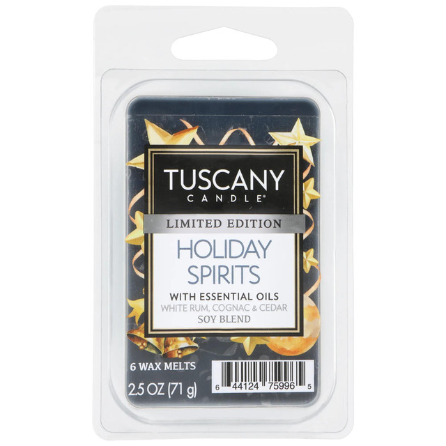 Fill your home with the rich, cozy scent of the season. This 6-pack of Holiday Spirits Wax Melts blends notes of rum, cognac, and cedar for a warm, inviting aroma. Made with a soy blend and infused with essential oils for a clean, lasting fragrance.
