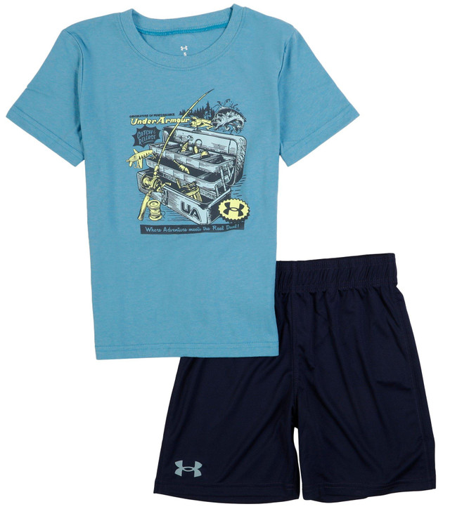 The Little Boys 2 Pc Retro Tacklebox Shorts Set hooks fun and comfort together. Made from a cotton-polyester blend, it features a soft t-shirt with a retro tacklebox graphic and easy pull-on shorts.
