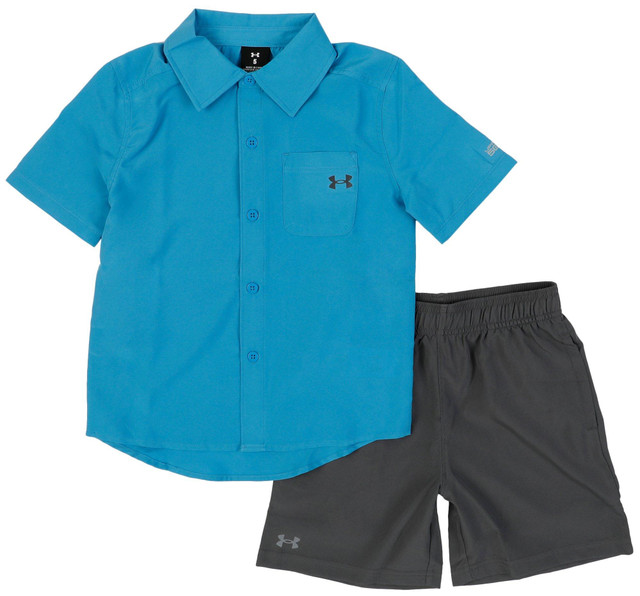 The Little Boys 2 Pc Shorts Set is perfect for warm-weather style and comfort. It features a short sleeve button-down shirt paired with easy pull-on shorts, offering a coordinated look that's great for playdates, outings, or casual days. UPF 50+ protection. Fabrication is 100% polyester.