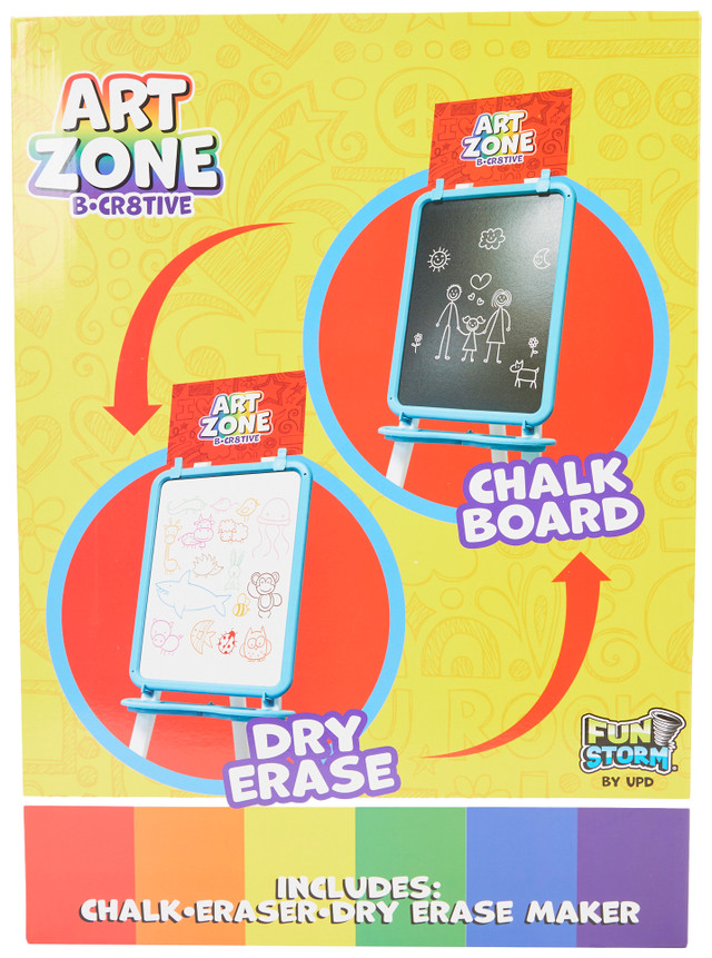 This kids standing easel flips easily from chalkboard to dry erase board, and includes chalk, an eraser, and a dry erase marker, inspiring creativity and endless artistic fun.