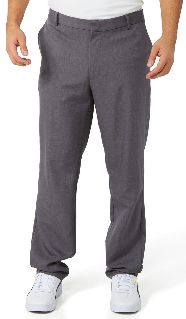 This mens pair of dress pants features a flat front and slim fit for a modern polished look. Designed with a bar and hook closure and zipper, these pants offer a sleek tailored style, perfect for work, formal events, or professional everyday wear. Fabrication is 100% polyester