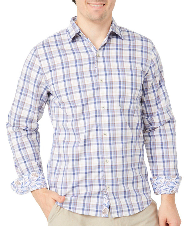 This men's long sleeve button down shirt features a classic plaid pattern and chest pocket. Designed for comfort and timeless style in casual or semi formal settings. Fabrication is 65% cotton, 31% polyester, and 4% elastane.