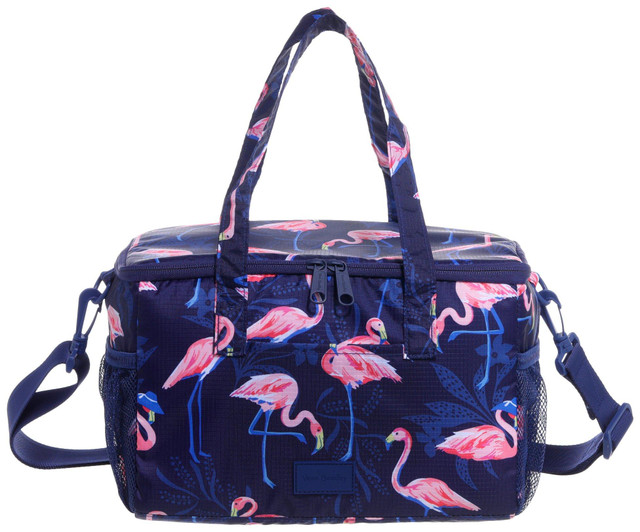 Keep your snacks and drinks cool in Florida style with the Flamingo Cooler in the fun, flamingo pattern featuring (2) exterior mesh pockets and 1) exterior nylon pocket. Also has an adjustable shoulder strap and two hand straps. Measures approximately 13 in x 8 in x 7 in.
