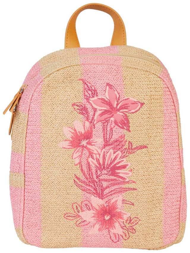 Playful yet practical, the mini candy pink stripe straw backpack is a delightful blend of charm and everyday ease. Its soft pink stripes dance across the woven straw body, radiating a carefree sweetness that complements sunny outings and spontaneous adventures. Dimensions: 3.5 in w x 7 in h x 9 in d.