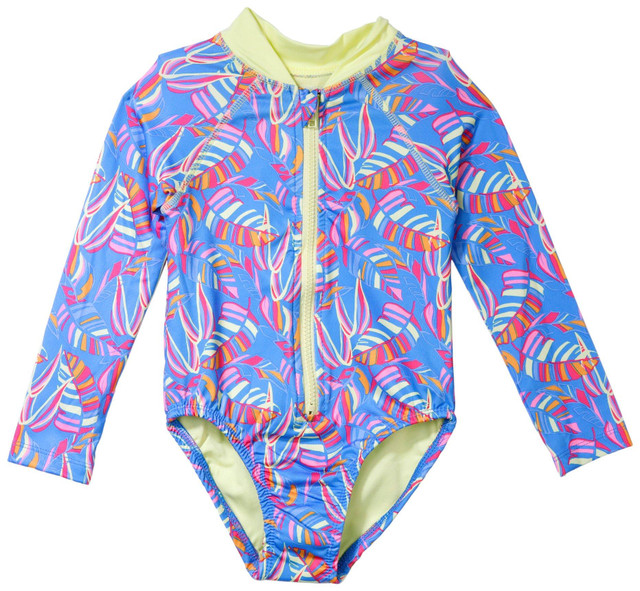 Designed with UPF 50 protection, it keeps her safe while she plays under the sun. The front zipper and neon yellow collar add a bold touch, while the multi leaf pattern over a rich purple background creates a vibrant tropical look. Made for comfort and easy movement, this suit is perfect for beach days and poolside fun, combining fashion and function for all her outdoor adventures.