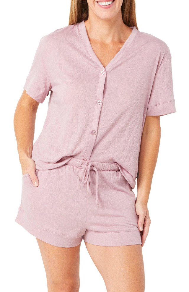 Unwind in style with this women's 2-piece pajama set, complete with a short-sleeve, button-down top and drawstring shorts. Crafted from soft, breathable fabric, its perfect for lounging or sleeping. The relaxed fit and adjustable waist offer all-night comfort, while the classic design keeps you looking effortlessly chic. Fabrication is 67% polyester, 32% rayon, and 1% spandex.