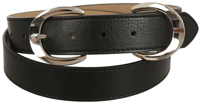 This Womens Belt features a solid color design on a vegan leather fabrication, partnered with a sleek metal belt buckle. Belt measures approximately 1.5 in. wide. Buckle measures approximately 2 in x 2 in.