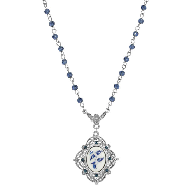 Enhance your collection with this exquisite silvertone adjustable necklace. Featuring an oval pendant with a charming blue willow two-bird design, it is set in a detailed filigree frame adorned with blue crystals. The vintage-inspired beaded chain adds a touch of elegance, making it a perfect accessory for any occasion. This necklace is ideal for those who appreciate intricate designs and timeless beauty. Length 16 in., width 32mm.