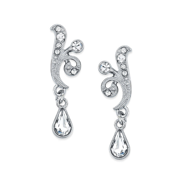 Elevate your bridal and special occasion look with our crystal-encrusted filigree drop earrings. The lightly antiqued silver tones create a vintage charm, while the teardrop-shaped crystal-colored stones add a touch of feminine elegance. These lush and sophisticated earrings are perfect for weddings and other memorable events. Shine with timeless grace and elegance.. Length 1.4 in., width 10mm.