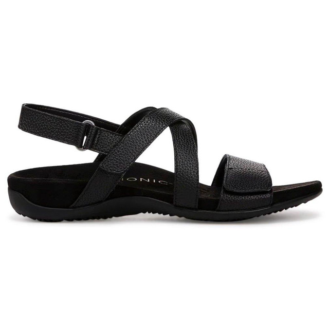 With an adjustable front strap and X-Cross instep, this sandal from Vionic provides all-day comfort for shopping or family activities. The back strap features a Velcro adjustable strap for extra ankle support. Designed Orthotic EVA footbed, Tumbled leather fabric. Wipe with a dry cloth.