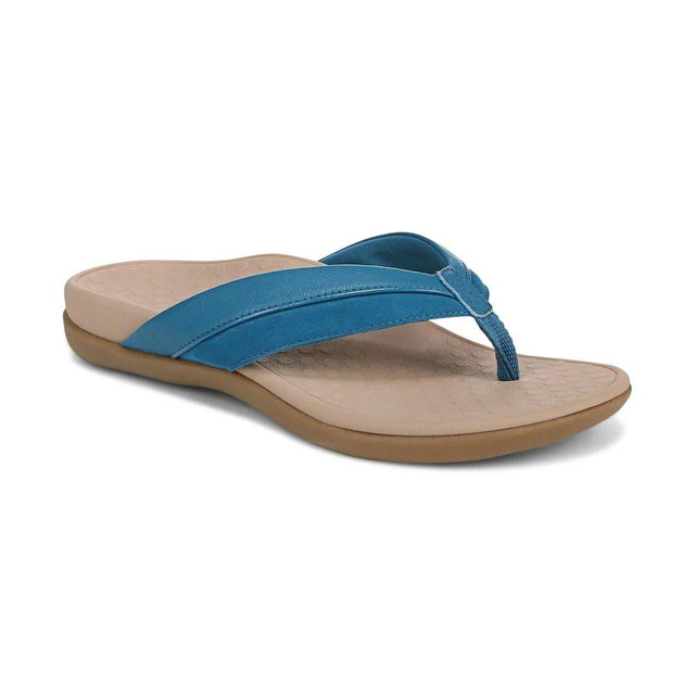 Vionic Shore Thong Sandals, featuring detailed premium uppers available in leather paired with either suede or canvas for versatile flair. Designed with a lightweight, flexible EVA midsole and our signature VioMotion Technology footbed that provides contoured arch support, shock-absorbing cushioning, and a deep heel cup for stability - complemented by a durable TPR outsole with a patterned tread - these sandals ensure lasting traction and all-day comfort while helping to alleviate heel pain.