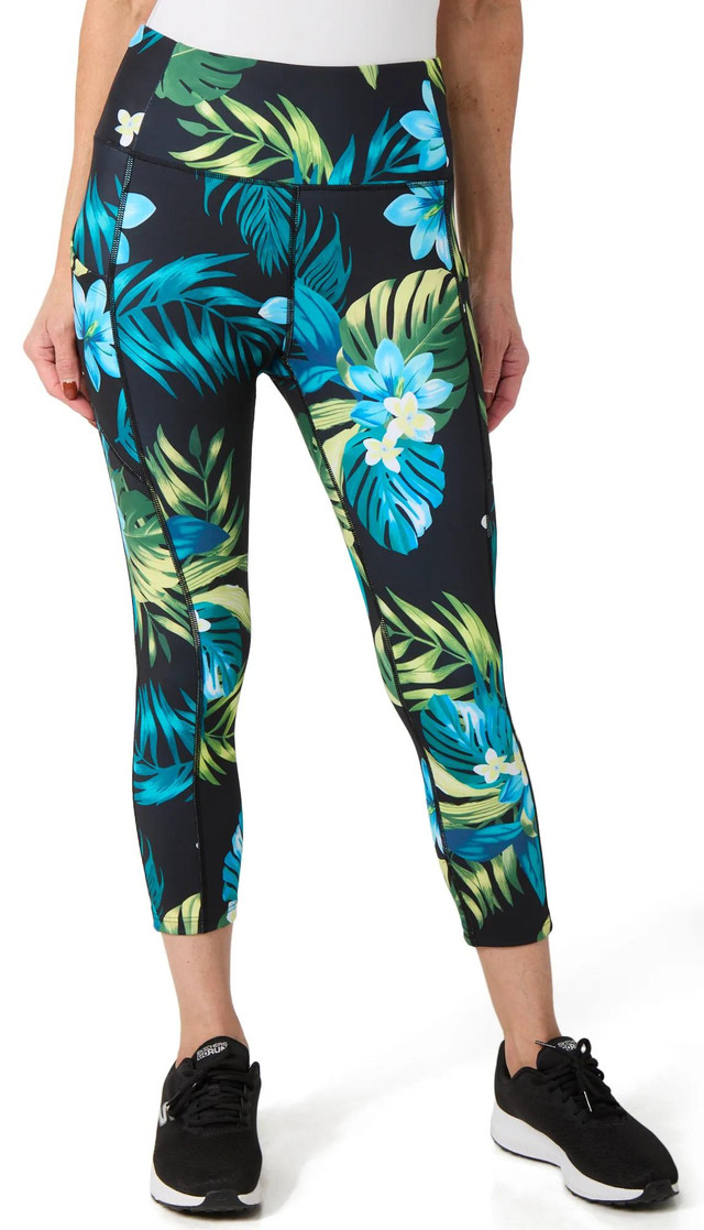 These women's tropical floral capri leggings feature performance stretch, side seam pockets, fade resistance, and moisture-wicking fabric. Designed for active comfort with vibrant style, they are perfect for workouts or casual wear. Fabrication 78% polyester, 22% spandex