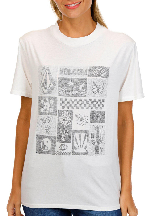 Embrace a coastal vibe with the Juniors Crew Neck Lock It Up Tee T-shirt featuring a front block pattern of screenprinted icons including floral, butterfly, palm trees and sun motifs. Designed with short sleeves and a classic crew neck for relaxed everyday wear. Fabrication is 100% cotton. Length measures approximately 26 in.