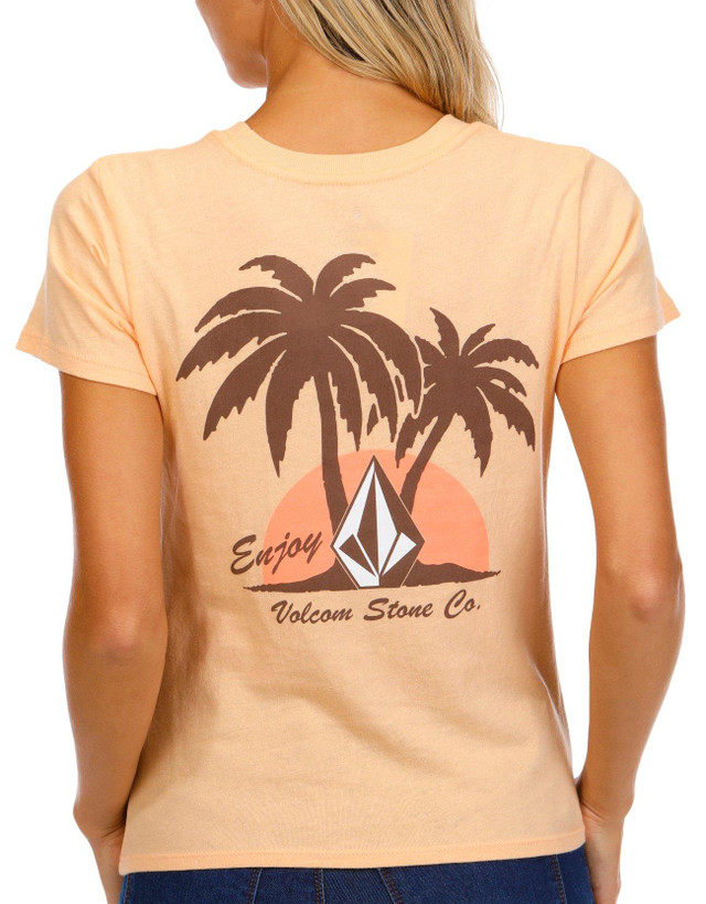 Capture laid back style with the Juniors Renegade Crew Neck Baby Tee T-shirt in soft peach featuring a large palm tree screenprint with text on the back and a matching smaller graphic at the front left chest. Designed with short sleeves and a classic crew neckline for easy everyday wear. Fabrication is 100% cotton. Length measures approximately 21 in.
