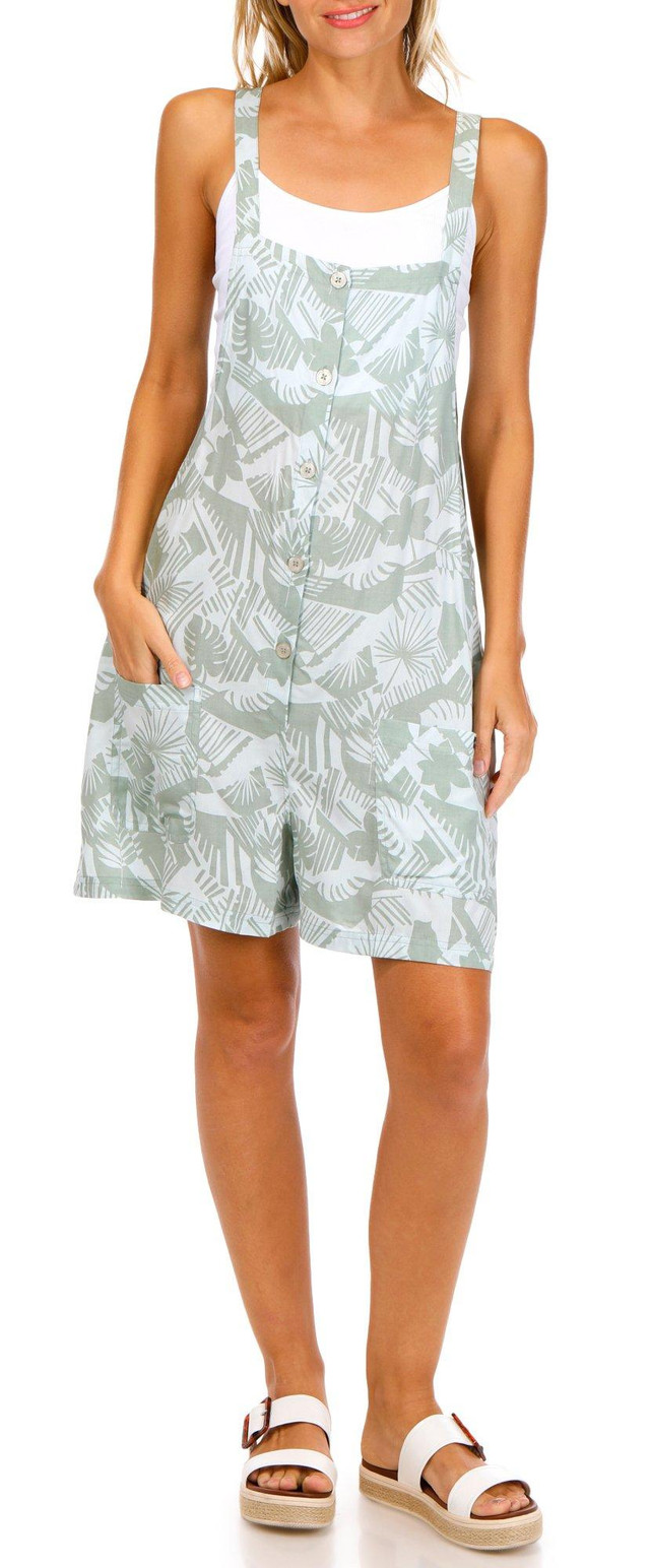 This juniors sleeveless palm leaf print romper is a breezy, stylish choice for warm days. Featuring a button-down front, 4 inch inseam, and convenient pockets, it combines tropical flair with everyday comfort. Perfect for casual outings or vacation-ready looks.