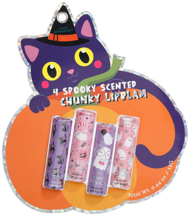 Add festive flair to your beauty routine with this 4 pk Halloween Spooky Scented Chunky Lip Balm Set, featuring themed scents named Hocus Pocus, Trick or Treat, Ghoul Friends, and Bone Chiller. Formulated cruelty free for worry free use. Ideal for gifting, party favors, or seasonal self care.