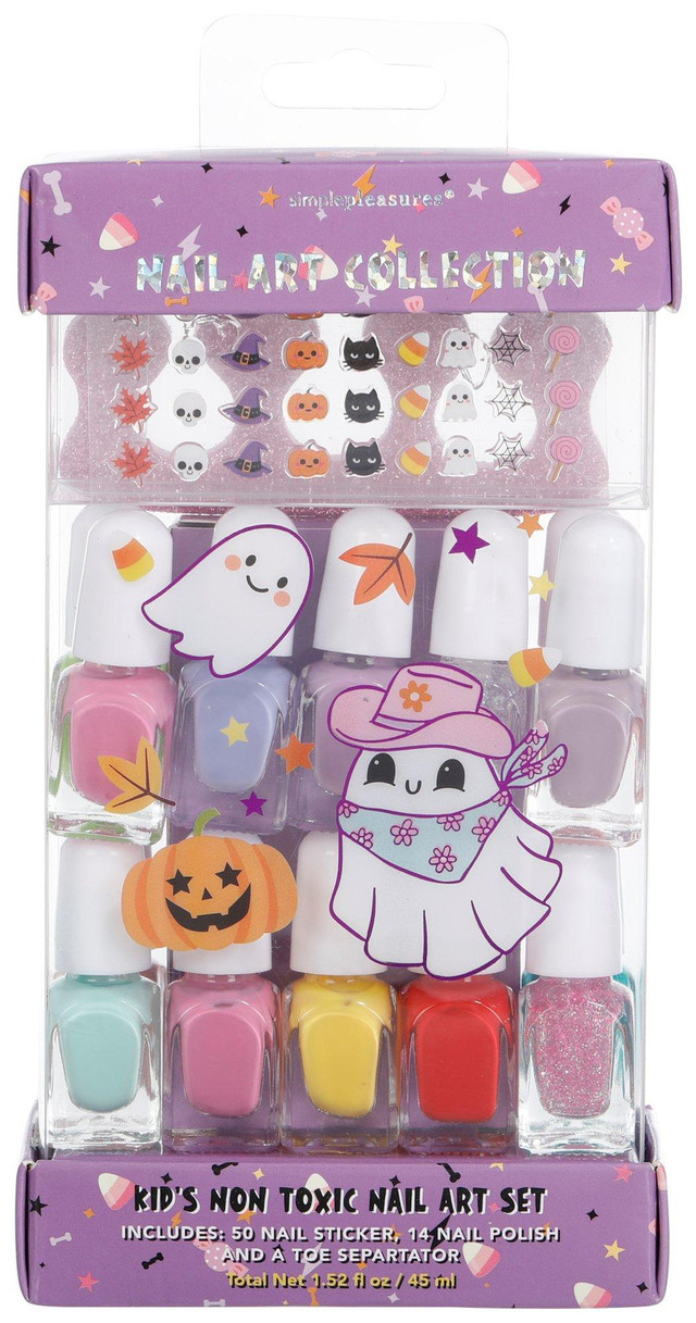 Encourage creative expression with this Girls Halloween Non-Toxic Nail Art Set, featuring 14 nail polishes, 50 themed nail stickers, and a toe separator for easy application. Formulated cruelty free and safe for young users. Perfect for costume parties, playdates, or festive self care. Safe for ages 6 years+.