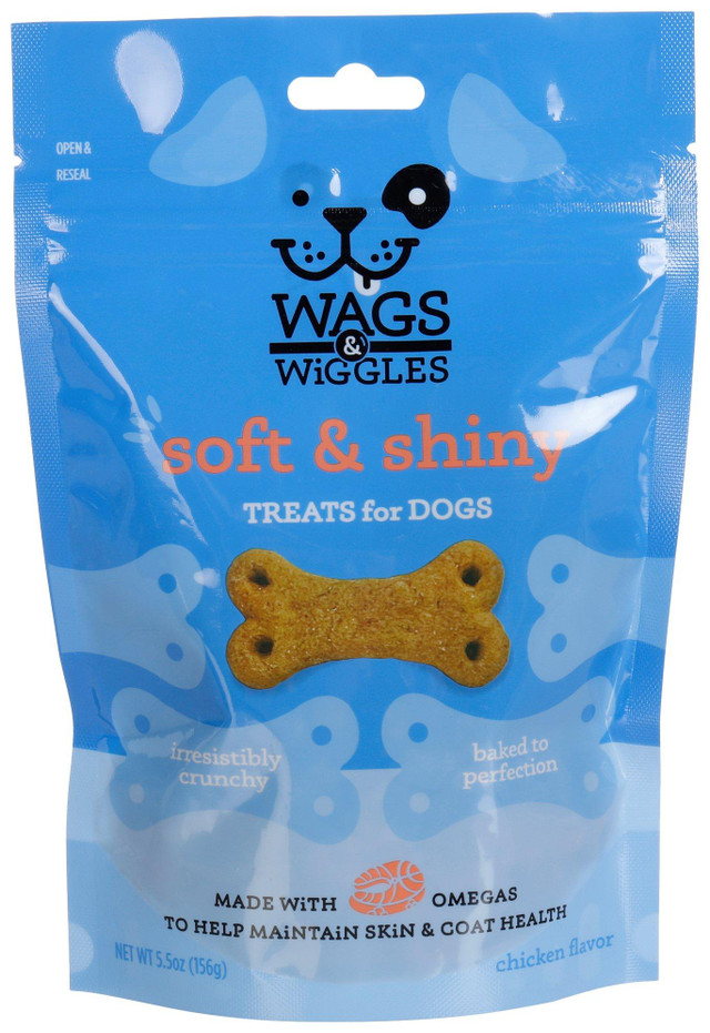 Wags and Wiggles Soft Shiney treats are made with omegas to support skin and coat health. These flavorful bites promote a soft shiny look your dog will love. Not suitable for dogs under 6 months or under 5lbs.