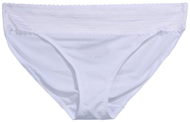 These bikini panties from Warner's feature a solid color design on a lightweight fabric, and a dig-free wide lace waistband for a comfortable smooth fit. Style #5509.