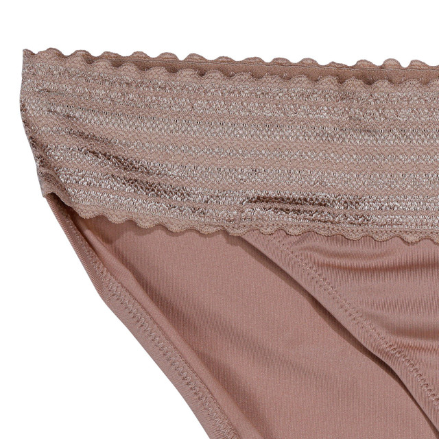 These bikini panties from Warner's feature a solid color design on a lightweight fabric, and a dig-free wide lace waistband for a comfortable smooth fit. Style #5509.
