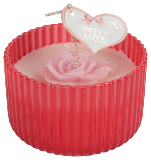 This 16 oz Sweet Love candle features a sweet pea scent and a stunning 3D rose inside a ribbed glass container. The detailed rose adds a romantic touch while the gentle fragrance creates a warm and inviting atmosphere. A beautiful piece for gifting or home decor.