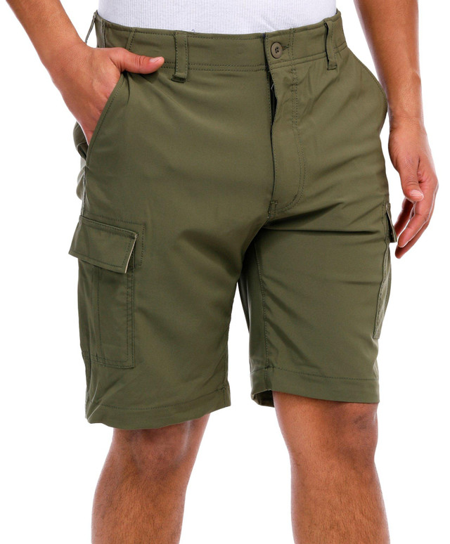 The Men's Tech Cargo Shorts are designed for both style and functionality. Made from a durable blend of polyester and spandex, these shorts feature a sleek solid color and a convenient button zip fly closure. With multiple pockets, including side, back, and cargo pockets, they offer ample storage for all your essentials. Perfect for outdoor activities or casual wear, these shorts combine practicality with a modern look.