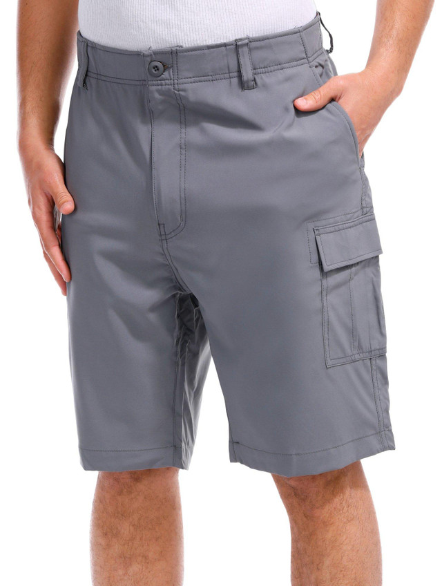 The Men's Tech Cargo Shorts are designed for both style and functionality. Made from a durable blend of polyester and spandex, these shorts feature a sleek solid color and a convenient button zip fly closure. With multiple pockets, including side, back, and cargo pockets, they offer ample storage for all your essentials. Perfect for outdoor activities or casual wear, these shorts combine practicality with a modern look.