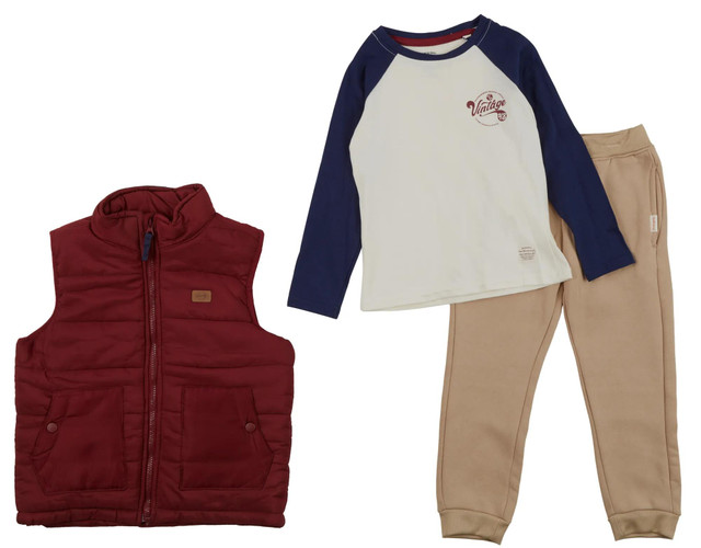 This little boys' 3-piece set includes a long raglan sleeve shirt, pull-on pants, and a puffer vest with a zip-up front closure. Perfect for layering, it offers warmth and style for cool-weather adventures.