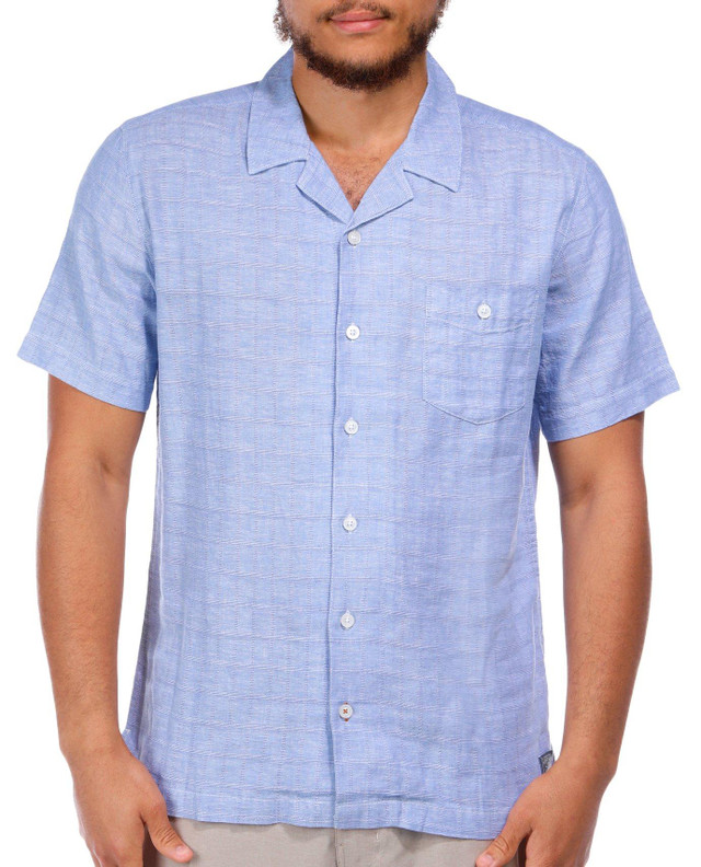 Introducing this Buttoned Short Sleeve Dobby Shirt, a perfect blend of style and comfort. Crafted from a soft linen blend, this shirt features a textured pattern that adds a touch of sophistication. The buttoned front and chest pocket provide classic detailing, making it ideal for both casual and semi-formal occasions. Fabrication is 55% linen, 45% cotton.