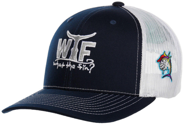Top off your look with the What The Fin Trucker Hat. Featuring a navy blue front panel with the signature logo, this cap blends laid-back style with everyday comfort. The white mesh back offers breathability, while the adjustable snapback closure ensures a perfect fit for any adventure.