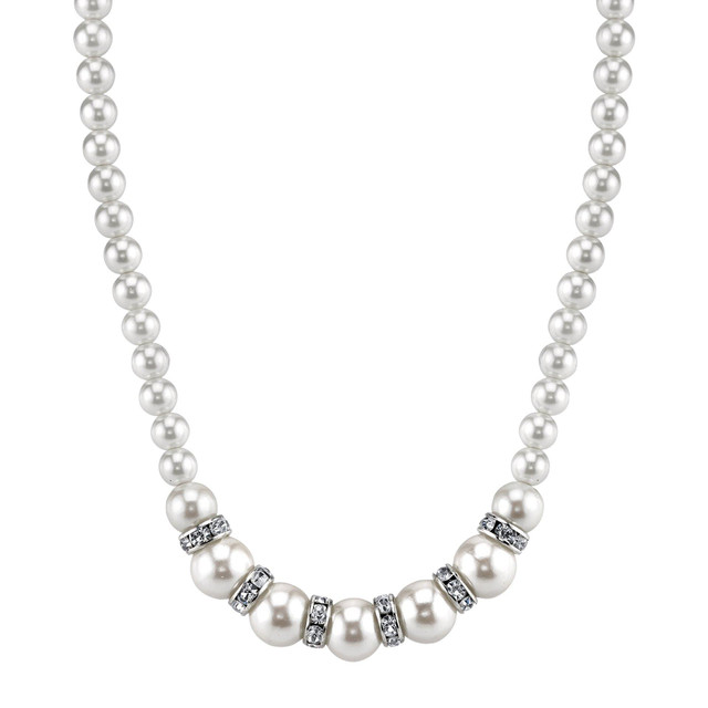 Elevate your elegance with this sophisticated white graduated faux pearl and crystal necklace. Featuring a delicate row of pearls interspersed with silver-tone crystal beads, this exquisite piece is perfect for weddings, brides, and special occasions. Its timeless design adds a touch of refinement and grace, making it an ideal accessory for those memorable moments. Embrace the beauty and sophistication of this elegant necklace, designed to make you shine. Length 15 in., width 10mm.