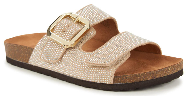 Step out in style with the White Mountain Granitas sandal. Embellished with shimmering rhinestones, this sandal adds a dazzling touch to your look. Two adjustable straps offer a perfect fit. Features leather upper, hook & loop strap closure, adjustable bucke strap closure, round open toe, synthetic lining, cushioned footbed, synthetic sole and 1 inch heel.