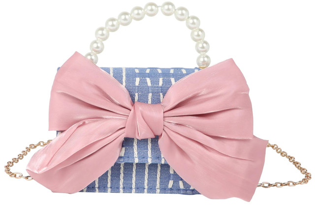 This girls crossbody handbag features a charming blue and white design with a large pink bow on the front and a pearl bead handle. The structured bag includes a lined interior, snap closure, and removable straps for versatile wear, combining style and functionality for everyday use. Measures approximately 4 in x 5.5 in x 2.25 in.
