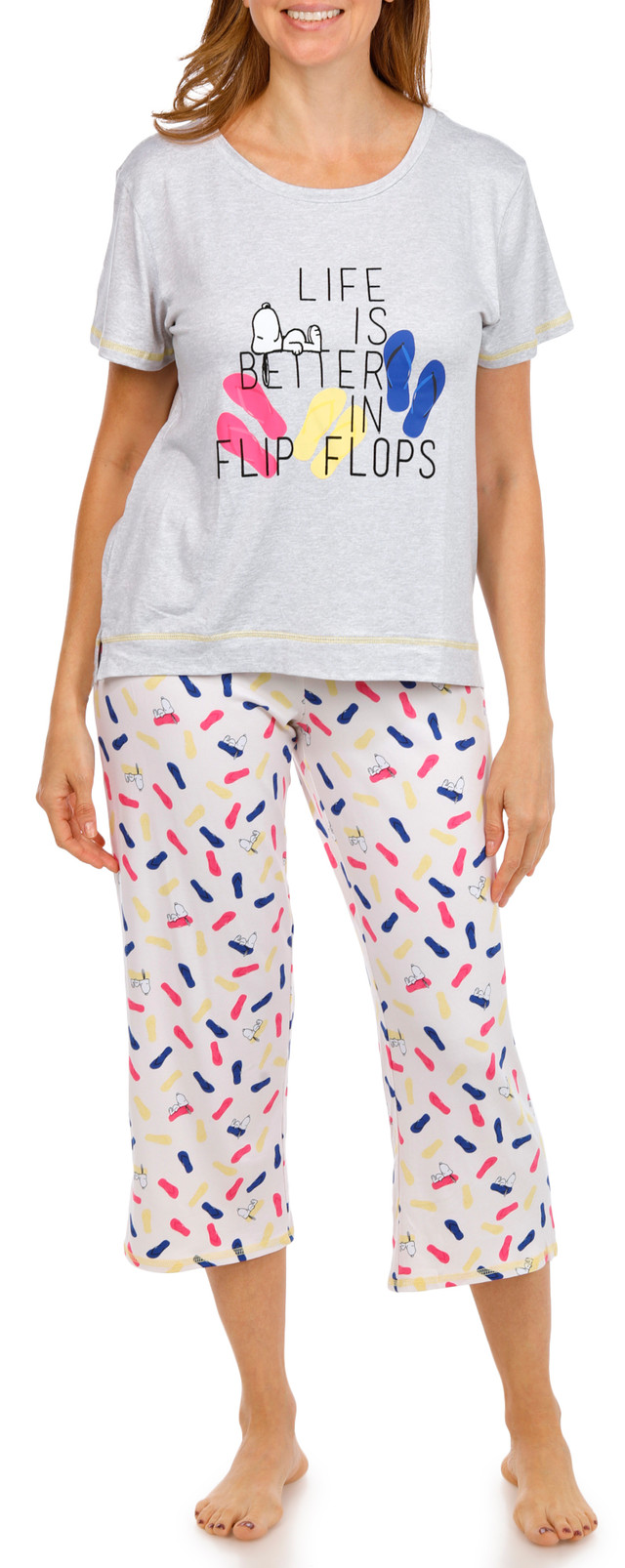 Unwind in cozy style with this Women’s 2 Pc Snoopy Pajama Pants Set. The set features a comfortable short sleeve top and matching pants, both accented with a fun Snoopy graphic. Soft and breathable, it’s perfect for sleeping, lounging, or enjoying relaxed days at home with a playful touch. Fabrication 95% polyester, 5% spandex