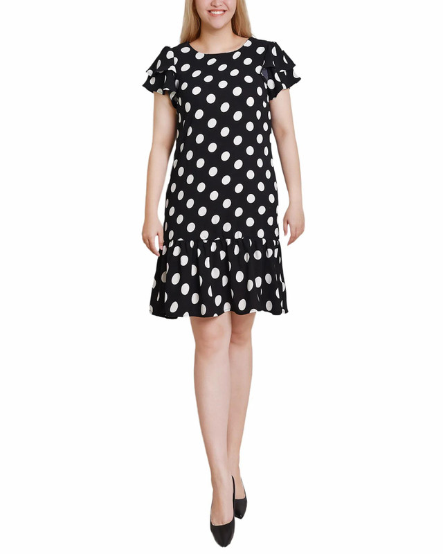 Step out in style with this short flutter sleeve dress, featuring a playful large dot design. The double layer flounce and wide flounced hem add a touch of whimsy, while the scoop neck enhances its flirty appeal. Perfect for both day and night outings, this dress effortlessly combines fun and sophistication, making it a versatile choice for any occasion. 100% polyester lining. Length measures approximately 38 in. Fabrication 100% polyester.