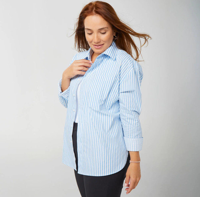 This Women's Long Sleeve Boyfriend Button Down Top is a versatile wardrobe staple. Featuring a striped pattern, button down front closure, point collar, and chest pocket, it offers a relaxed yet polished look perfect for layering or wearing on its own. Fabrication 100% cotton