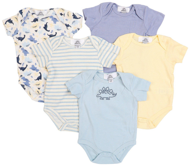 Add prehistoric charm to your babys wardrobe with this 5-pack of dinosaur-themed short sleeve bodysuits. Each features fun, assorted prints and patterns, soft knit fabric, and a comfy fit. Designed with overlapping shoulders for easy on and off, plus a secure three-snap bottom closure for quick diaper changes. These bodysuits are as practical as they are playful. Fabrication is 60% cotton, 40% polyester. Length measures approximately 14 in.
