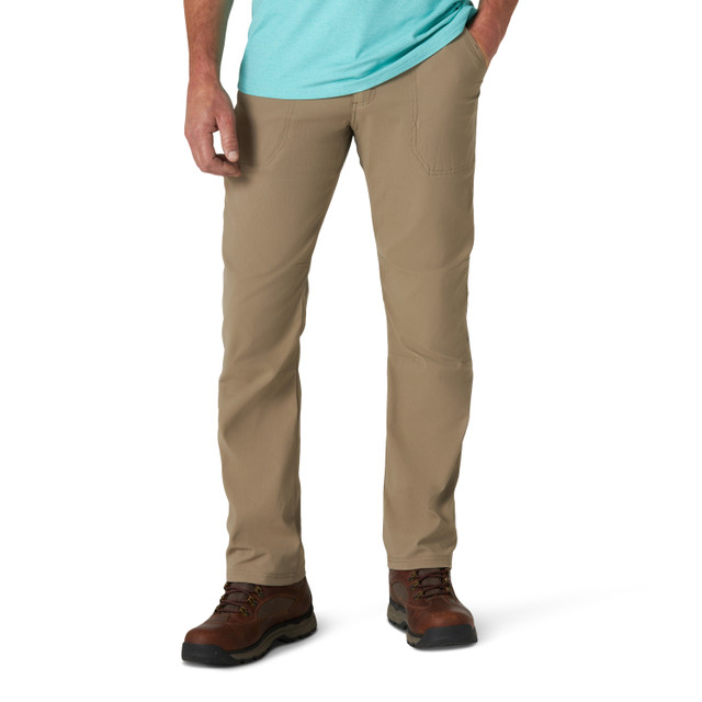 Durable stretch pants for outdoor wear, made from 97% nylon / 3% spandex with a DWR water-repellent finish. Features a regular straight-leg fit, gusseted crotch, articulated knees, reinforced belt loops, UPF sun protection, and a secure side zip pocket for essentials.