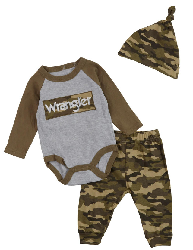 This baby boys' 3-piece camo pajama set includes a long sleeve creeper with a bold brand logo, camo print pull-on pants, and a matching camo hat. Cozy and stylish, it is perfect for bedtime or lounging in playful comfort.