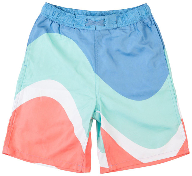 These shorts feature a playful mix of green blue white and orange creating a vibrant look for any sunny day Outfitted with two front pockets and one back pocket they offer both style and convenience Whether lounging by the beach or exploring the outdoors these shorts are designed for comfort and fun. With a 7 in. inseam these quick to dry swim trunks are a must for hot summer days.