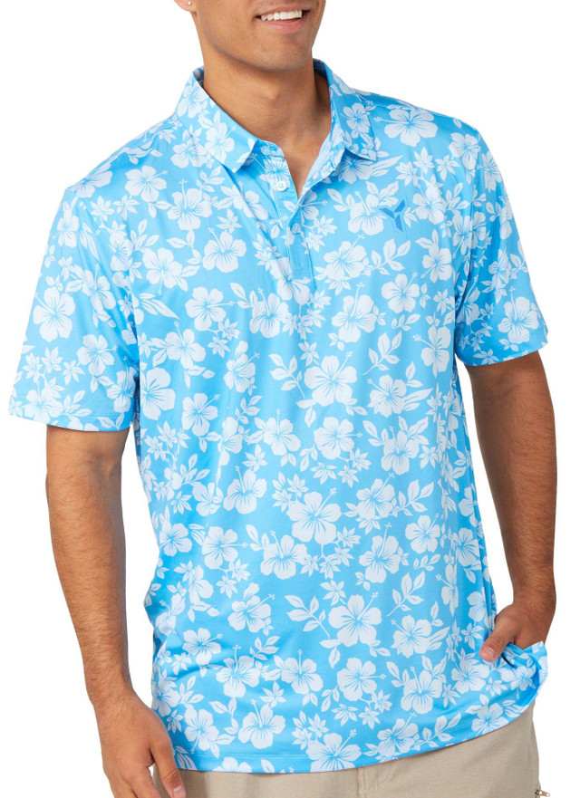 Bring tropical vibes to the course with the Men's Aloha Aina Golf Polo. It features a hibiscus print, 4-way stretch, wrinkle resistance, moisture-wicking tech, and UV 40 sun protection. Fabrication is 95% polyester, 5% spandex