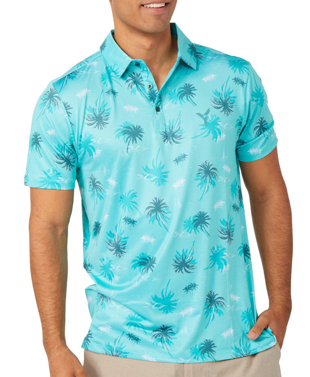 Bring coastal vibes to the course with the Men's Island Living Golf Polo. It features a palm tree print, 4-way stretch, wrinkle resistance, moisture-wicking tech, and UV 40 sun protection. Fabrication is 95% polyester, 5% spandex