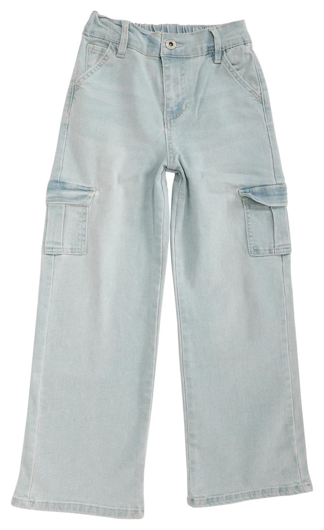 Update casual looks with the Big Girls Light Wide Leg Cargo Denim Jeans. Crafted in light wash denim, the design features an elastic waist, side pockets including a coin pocket, and cargo pockets on each leg for utility style. Ideal for everyday wear with a modern edge. Fabrication is 77% cotton 20% polyester 2% viscose 1% spandex.