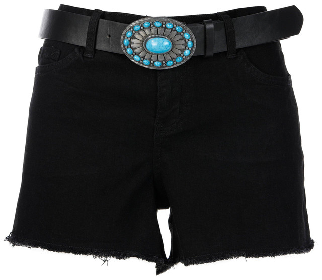This juniors pair of denim shorts features a belted waist and basic 5-pocket styling for everyday versatility. Frayed bottoms add a casual edge, making them a fun choice for warm weather and laid back looks. Inseam is approximately 3 in. Fabrication is 69% cotton, 28% polyester, and 3% spandex.