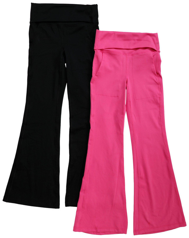Experience versatile comfort with the Big Girls Active 2 Pk Fold Over Flare Leggings. Featuring a fold over top band and flare bottom leg hem, each pair offers a flexible fit in two different solid colors. Ideal for active wear or casual outings. Fabrication is 90% polyester, 10% spandex.